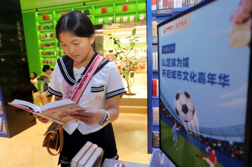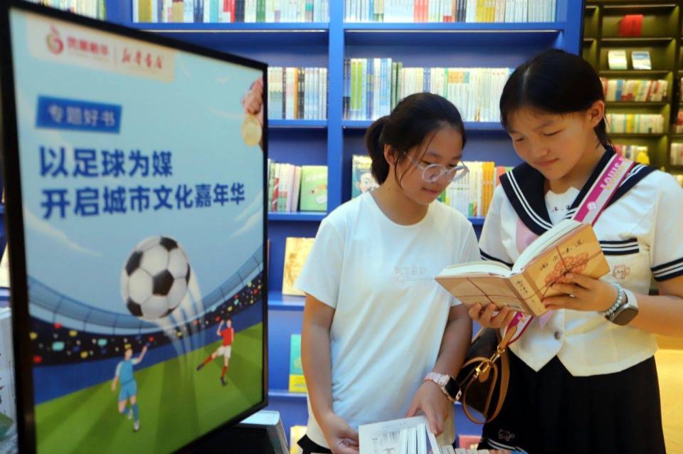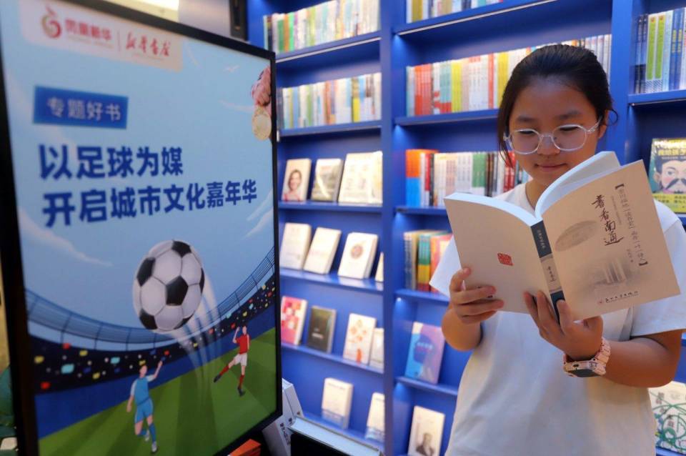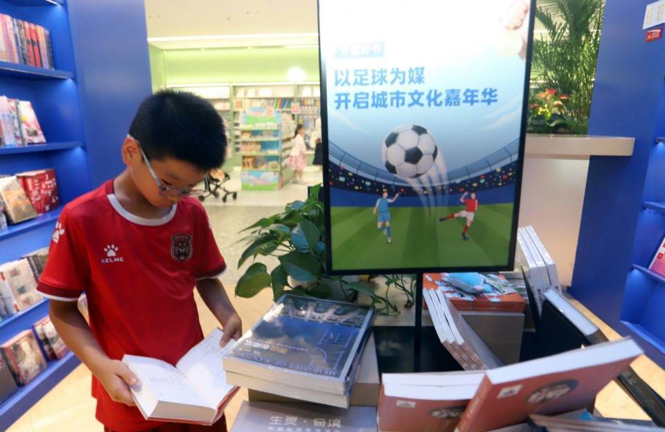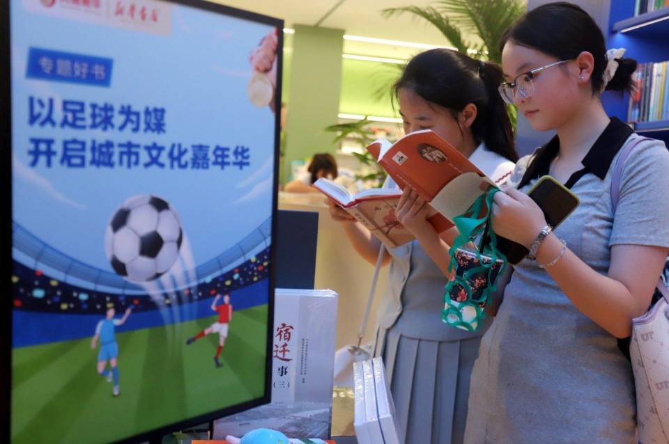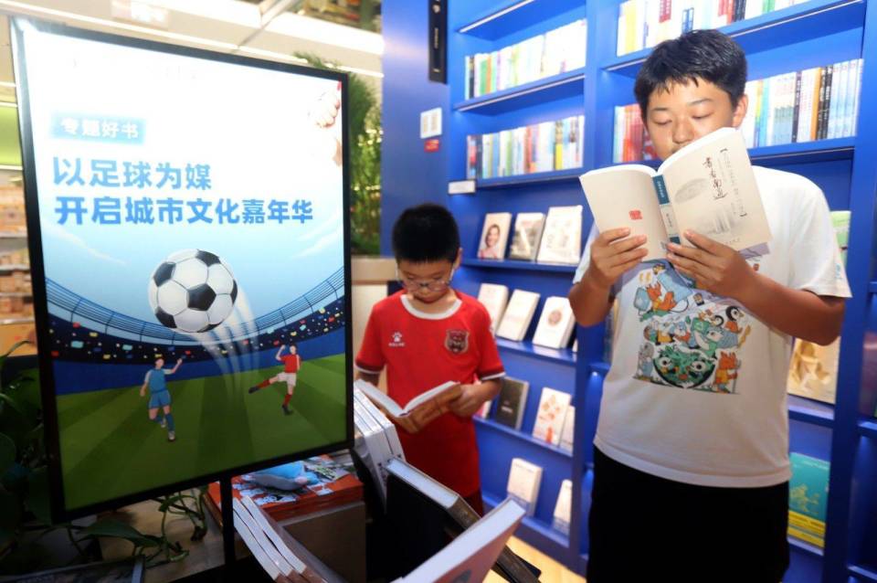 2025年8月4日,江苏省城市足球联赛正如火如荼地进行,苏州市姑苏区一家书店特设置苏超书籍专柜,介绍苏超足球联赛各城市深厚的文化底蕴,吸引读者前来阅读。王建康